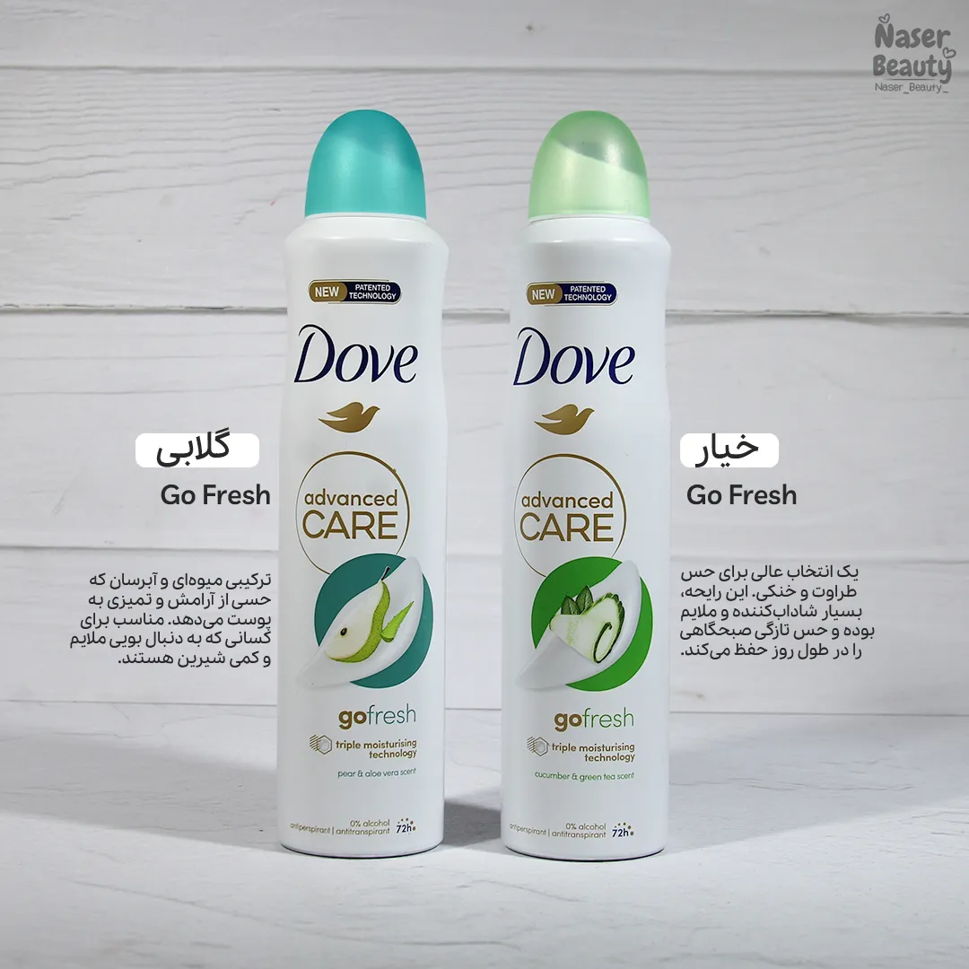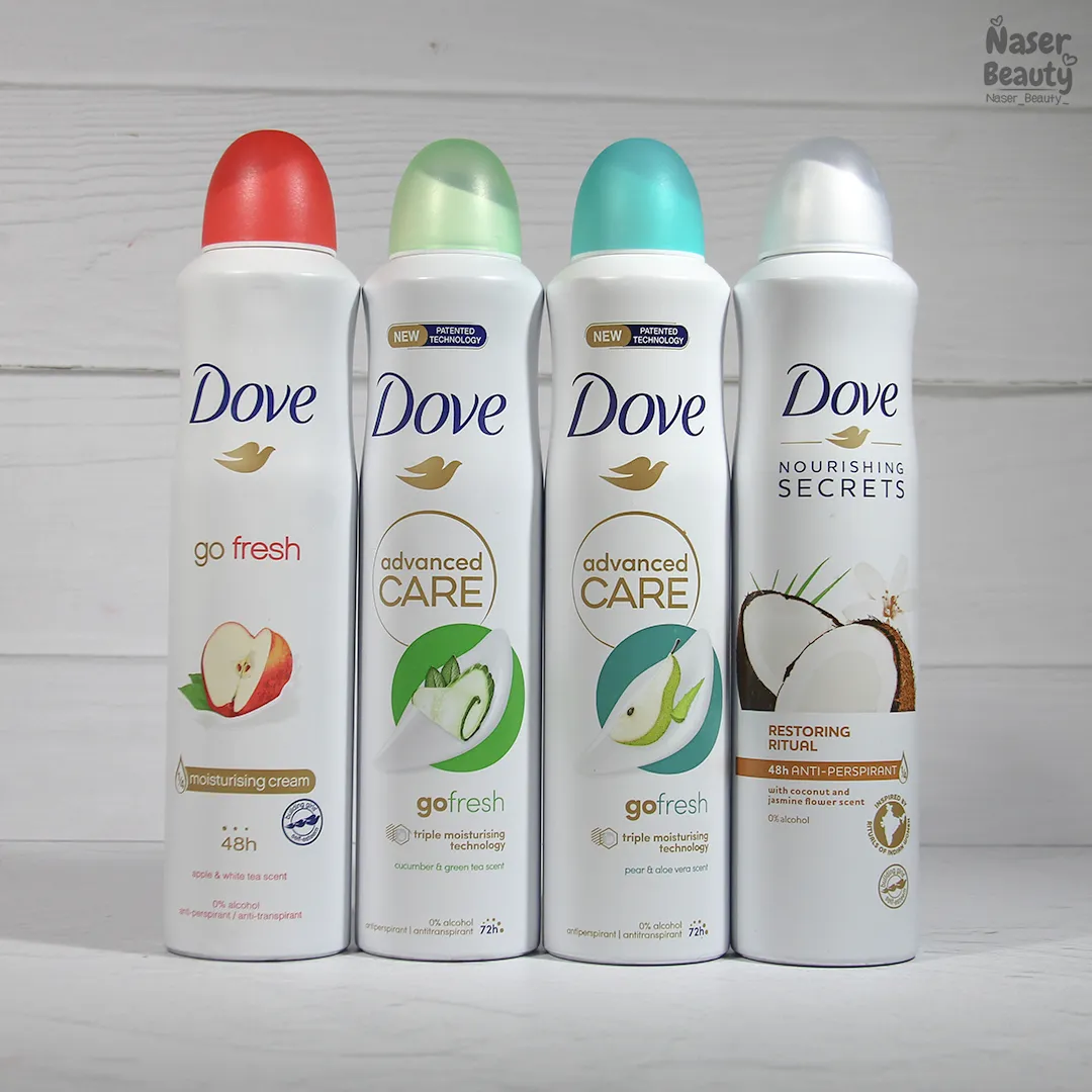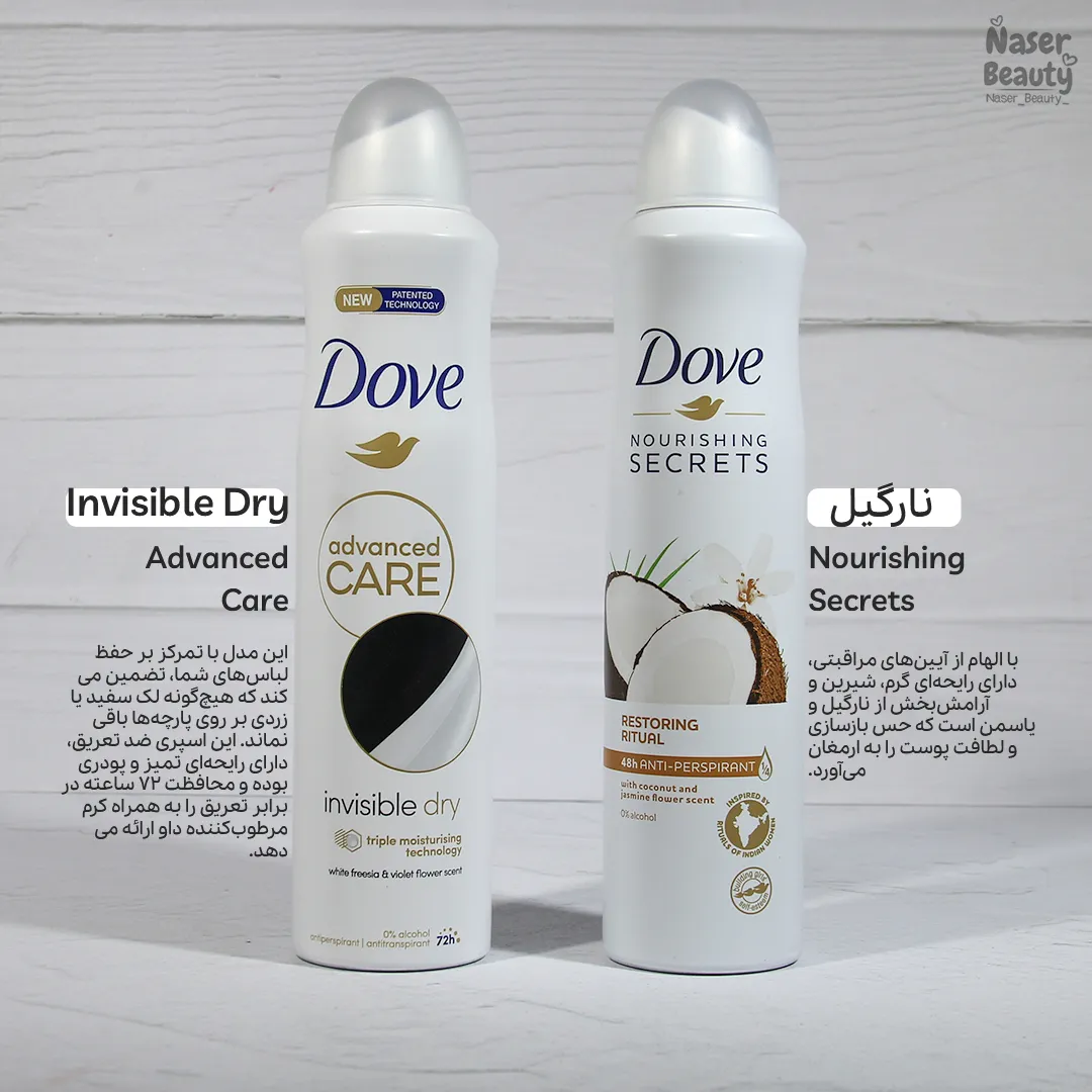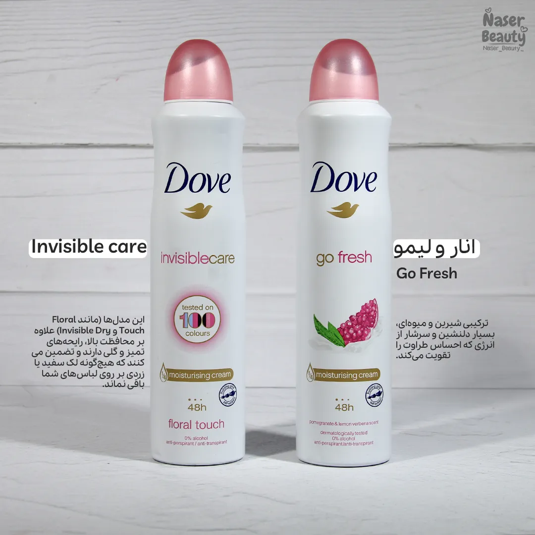 • مدل Advanced Care Invisible Dry: این مدل با تمرکز بر حفظ لباس‌های شما، تضمین می‌کند که هیچ‌گونه لک سفید یا زردی بر روی پارچه‌ها باقی نماند. این اسپری ضد تعریق، دارای رایحه‌ای تمیز و پودری بوده و محافظت 72 ساعته در برابر تعریق را به همراه کرم مرطوب‌کننده داو ارائه می‌دهد.