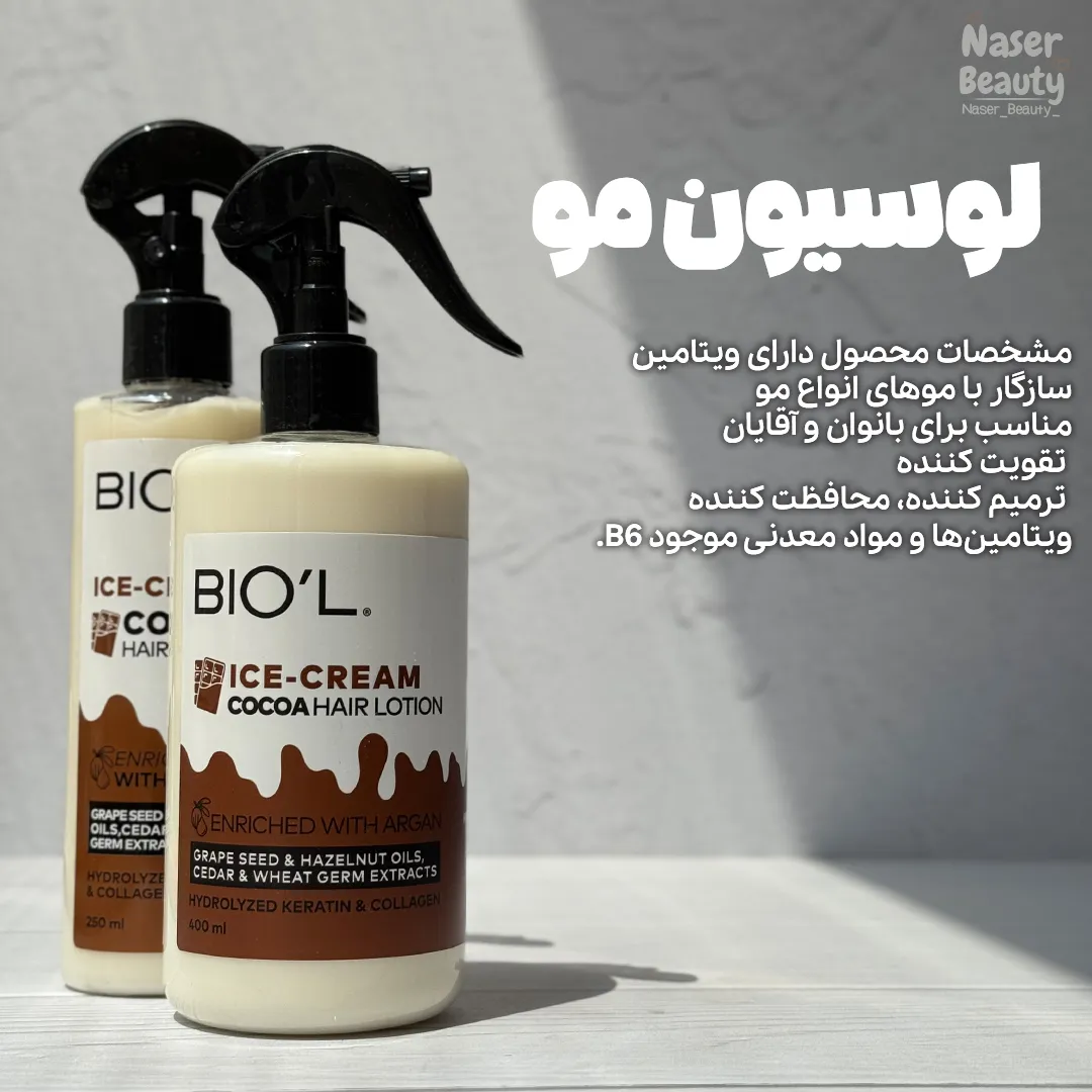 - لوسیون بستنی 400 میل بیول: یک محصول بدون نیاز به آبکشی برای استفاده پس از حمام. این لوسیون با بافت سبک و جذب سریع، به آبرسانی، رفع وز و الکتریسیته ساکن مو کمک میکند. حاوی روغنهای مغذی مانند آرگان، هسته انگور و فندق است که به تقویت ساقه موها و محافظت از آنها در برابر حرارت و آلودگیها کمک میکند.
